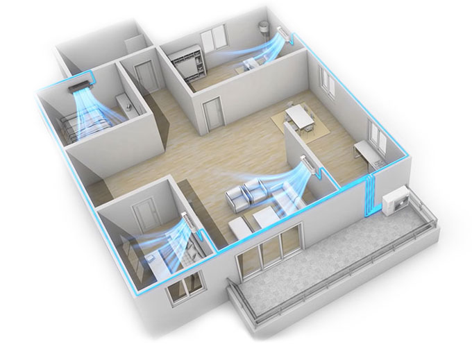 w mieszkaniach lub domach oba systemy klimatyzacji mogą funkcjonować obok siebie. Sprawdzą się doskonale na przykład w mieszkaniach dwupoziomowych. Zdarza się, że nawet w mniejszych lokalach zaleca się zastosowanie 2 oddzielnych systemów typu split. Taka sytuacja może być spowodowana m.in. zbyt dużą odległością pomiędzy agregatem a klimatyzatorem wewnętrznym, co przekładałoby się na niższą wydajność pracy urządzenia, wyższe koszty instalacji itp. Zdarza się również, że w budynku istnieją ograniczenia technologiczne, które uniemożliwiają zbudowanie większego systemu. Takie rozwiązanie ma także swoje zalety — w przypadku awarii jednej klimatyzacji typu split drugi system będzie wciąż działać.