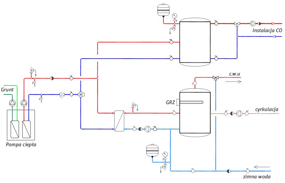 system mający za zadanie przechowywać i rozprowadzać wytworzone przez pompę ciepło.